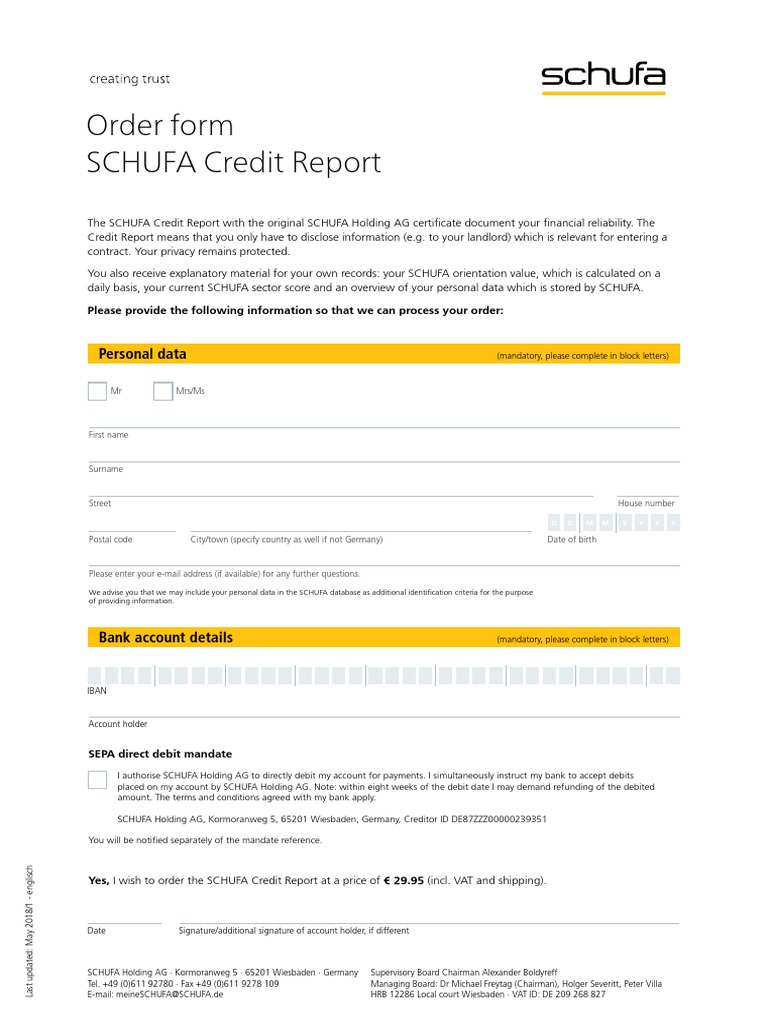 Since 1927 schufa has been germanys leading information and service partner to corporate and private customers. If you dont have an address to send it to and your name isnt on the letterbox they wont deliver it to you so mine was sent back to the sender and i had to call them several times as few of the employees speak english and convince them that i was me so they could give me a code to access it online. Postbank erhalten sie ihre schufa bonitaetsauskunft innerhalb der jeweiligen servicezeiten zum preis von 2995 direkt zum mitnehmen. Mit einer vollautomatischen unternehmensauskunft unterstuetzt die schufa banken und sparkassen bei der validierung der antraege zu den kfw schnellkrediten die ab heute zur verfuegung stehen.
