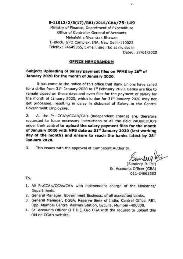 Uploading Of Salary Payment Files On Pfms By 28th Of January 2020