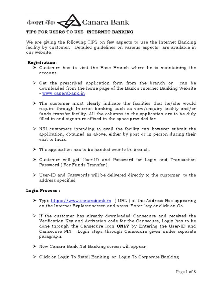 Canara Bank Net Banking User Guide Online Banking Personal